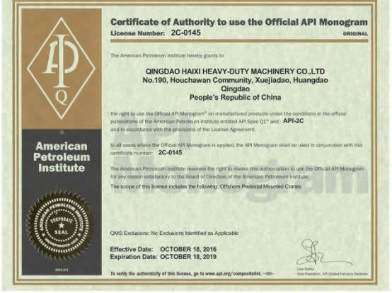 熱烈祝賀海西重機(jī)榮獲API-2C產(chǎn)品許可證書