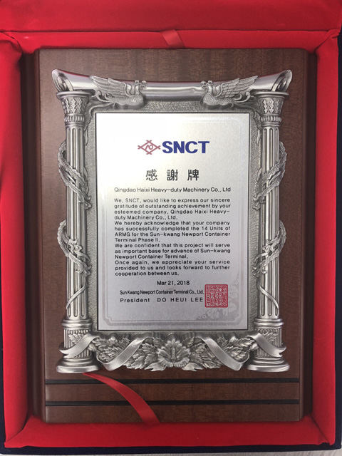 近日,海西重機(jī)收到來自韓國仁川新港鮮光新港集裝箱碼頭(SNCT)總裁李道熙代表SNCT授予的“感謝牌”,對海西重機(jī)在2017年和2018年兩個自動化項目中的優(yōu)秀表現(xiàn)給予高度認(rèn)可,對海西所交付設(shè)備在碼頭發(fā)展中起到的重要作用表示感謝。