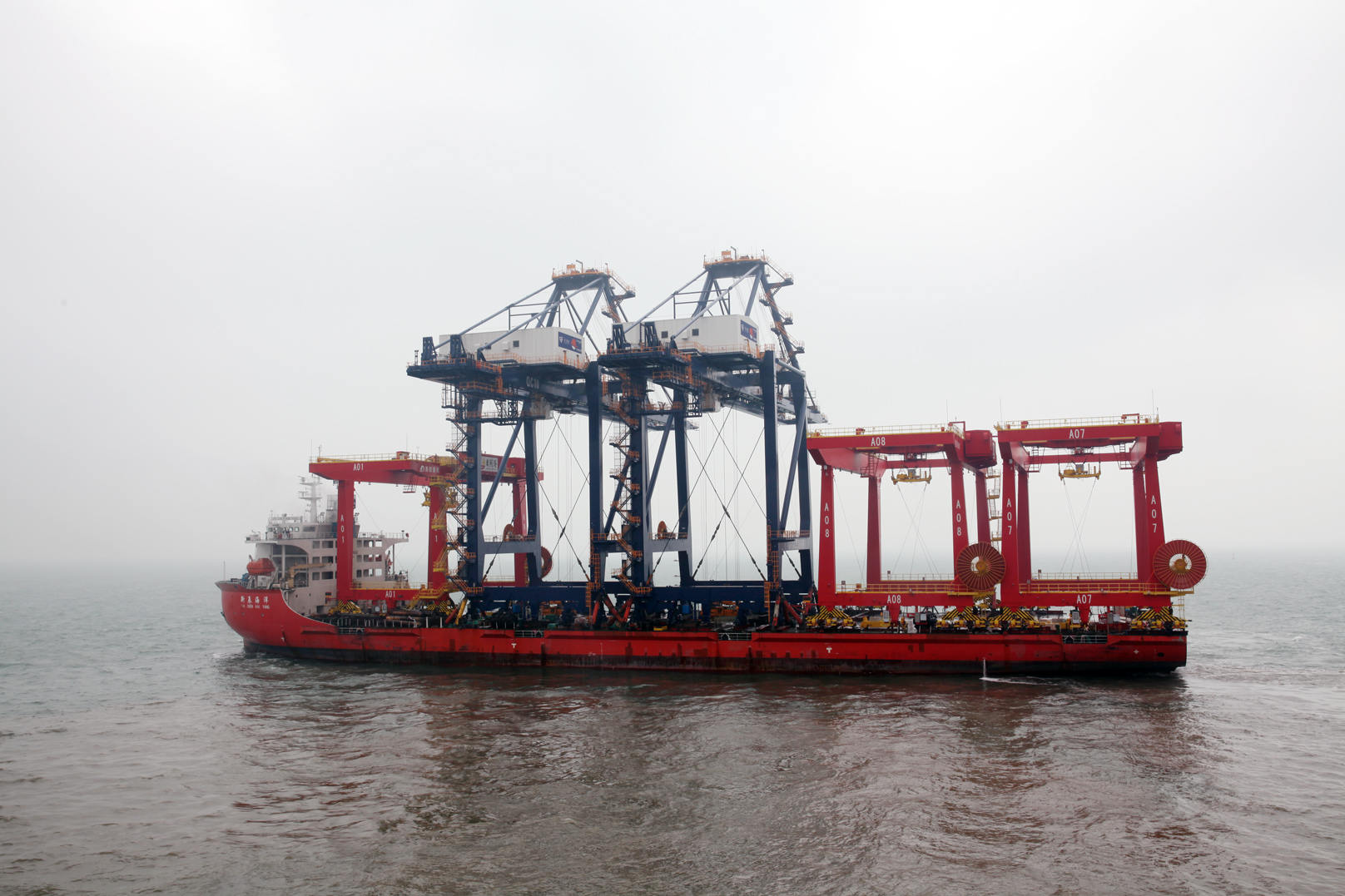 11月5日10時(shí)58分,碼頭現(xiàn)場(chǎng)鞭炮齊鳴,汽笛長(zhǎng)鳴,伴隨著運(yùn)輸船主機(jī)運(yùn)轉(zhuǎn)的轟鳴聲,裝載海西重機(jī)為寧波舟山港乍浦港區(qū)承制的2臺(tái)50t-38m岸邊集裝箱起重機(jī)(簡(jiǎn)稱G216項(xiàng)目)和為日照港集裝箱發(fā)展有限公司承制的第二批3臺(tái)自動(dòng)化軌道式集裝箱龍門起重機(jī)(簡(jiǎn)稱G219項(xiàng)目)的運(yùn)輸船緩緩駛離公司碼頭,標(biāo)志G219項(xiàng)目第二批設(shè)備和G216項(xiàng)目順利發(fā)運(yùn)。
