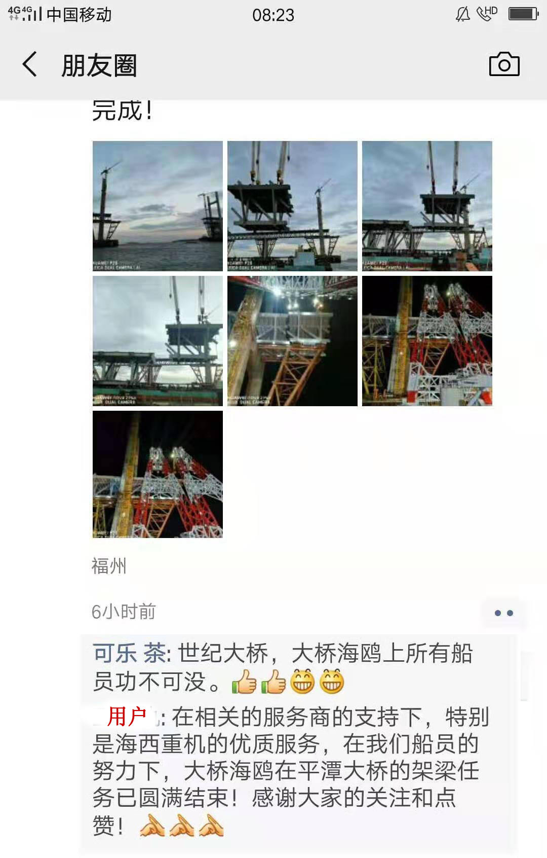 7月28日接到用戶通知,“大橋海鷗號(hào)”將于7月28日晚進(jìn)行第64、65片8鋼梁的架設(shè)(單重達(dá)3200噸),為保證工程順利實(shí)施,請海西重機(jī)安排技術(shù)人員進(jìn)行保駕護(hù)航,用船長的話就是“你們在現(xiàn)場,感到心里踏實(shí)”。公司當(dāng)即安排附近正在羅源灣碼頭做電控系統(tǒng)改造的宋靖浩工程師,前往現(xiàn)場。7月2900日傍晚5點(diǎn),吊裝正式開始,各崗位人員各負(fù)其責(zé),密切配合。直到凌晨時(shí)分,2片鋼梁順利架設(shè)完成,設(shè)備運(yùn)行一切正常,用戶對(duì)海西重機(jī)設(shè)備的穩(wěn)定性和服務(wù)的及時(shí)性給予了高度評(píng)價(jià)。至8月6日,平潭海峽公鐵大橋,最后一片鋼梁順利架設(shè)完成, “大橋海鷗號(hào)”不辱使命,圓滿完成任務(wù)。用戶喜悅的表揚(yáng),就是對(duì)我們優(yōu)質(zhì)服務(wù)的認(rèn)可和正反饋。