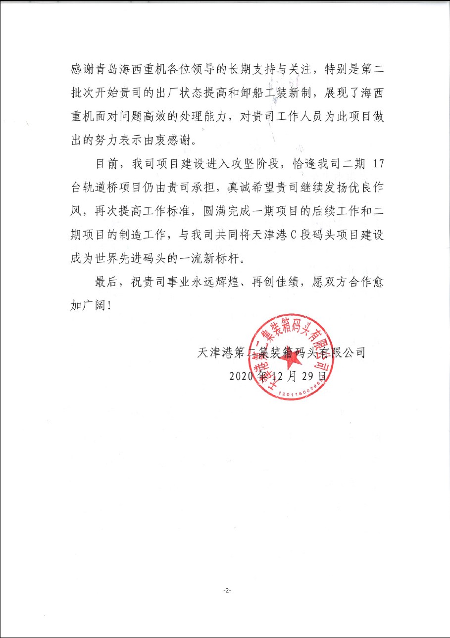 表?yè)P(yáng)信的最后,天津港業(yè)主也對(duì)海西重機(jī)領(lǐng)導(dǎo)班子對(duì)于此項(xiàng)目的關(guān)注與支持表達(dá)了特別感謝,對(duì)于海西重機(jī)承制的二期17臺(tái)軌道吊項(xiàng)目表達(dá)了高度信任和美好期許!