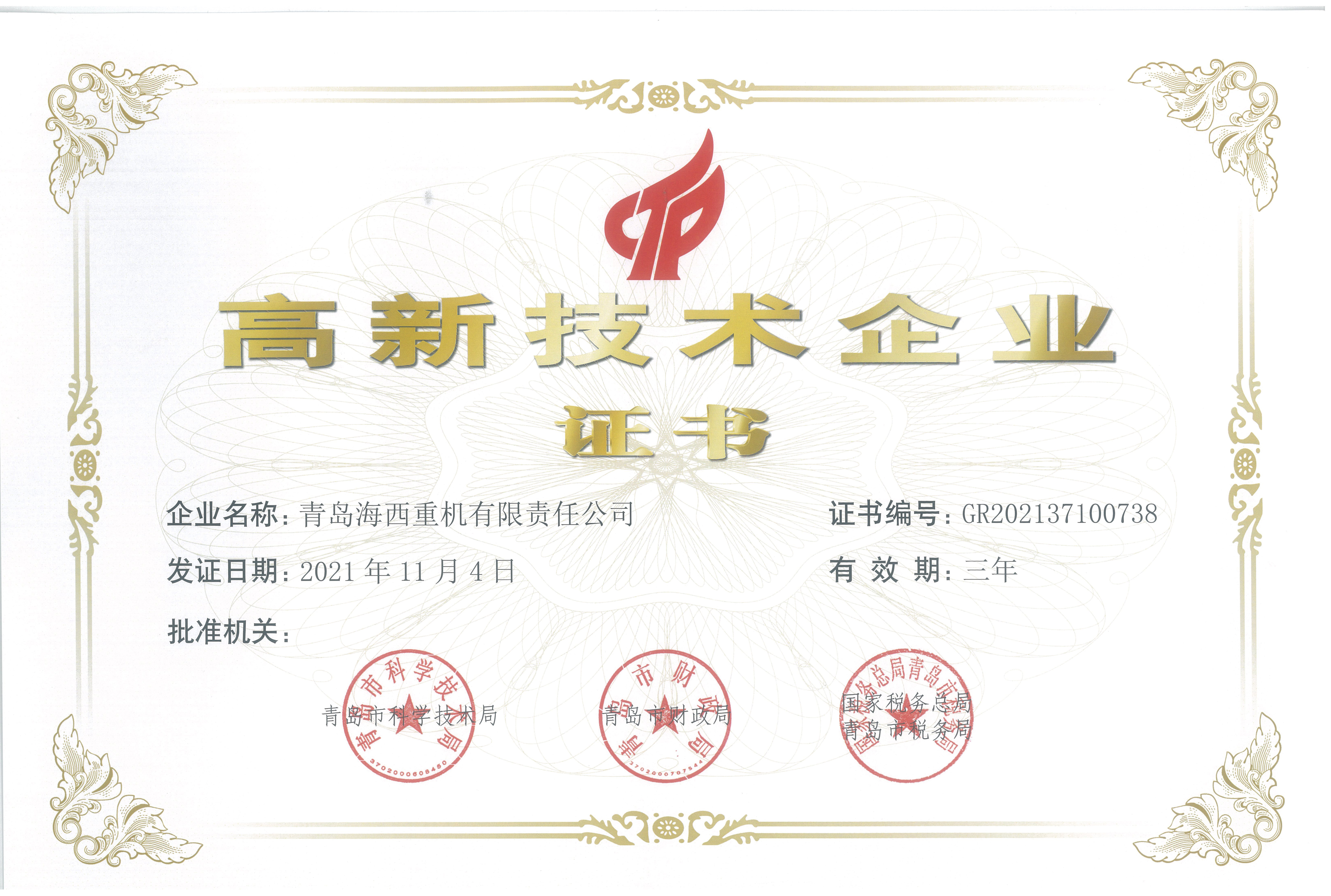 成功通過高新技術(shù)企業(yè)認定,對于提高市場經(jīng)營競爭力,提升企業(yè)品牌影響力具有重要作用,是公司實力和能力的體現(xiàn)。多年來,海西重機一直堅持突出技術(shù)引領戰(zhàn)略,強化技術(shù)創(chuàng)新,以技術(shù)創(chuàng)新帶動高質(zhì)量發(fā)展為重點,取得了較好成績。公司獲得了山東省首臺套技術(shù)裝備3項、山東精品裝備產(chǎn)品2項、山東創(chuàng)新工業(yè)產(chǎn)品1項、集團公司科技獎勵6項,青島市科技獎1項,科技成果鑒定11項,西海岸區(qū)級人才2人……