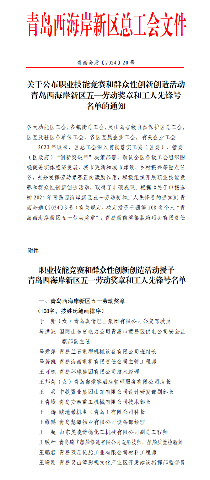 近日,青島西海岸新區(qū)總工會傳來喜訊,作為西海岸新區(qū)“職工創(chuàng)新成果”二等獎成果——“40T系列自動化軌道吊及其系統(tǒng)”的第一完成人,馬著凱同志被授予西海岸新區(qū)“五一勞動獎?wù)隆睒s譽(yù)稱號。