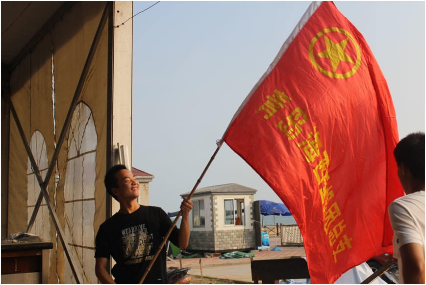 圖為團委成員在活動現(xiàn)場樹立“青島海西重機團委”旗幟