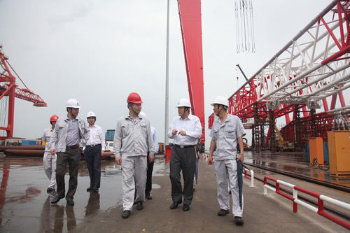 在參觀公司現(xiàn)場建成自用的1600噸龍門吊項目、正在吊裝上船的3600噸全回轉(zhuǎn)浮吊項目、面對公司的120米突堤碼頭以及繁忙的生產(chǎn)組裝現(xiàn)場,董總對公司的經(jīng)營發(fā)展態(tài)勢予以充分肯定。他說:在當(dāng)前市場經(jīng)濟低迷的形勢下,青島海西重機能夠抓住發(fā)展機遇,逆勢而上,尤其在技術(shù)創(chuàng)新和產(chǎn)品開發(fā)方面發(fā)揮了自身潛能,具有前瞻性和市場眼光,更是武漢船機公司在船市低迷的情況下,產(chǎn)品結(jié)構(gòu)調(diào)整的有力體現(xiàn)。董總特別對近期在煙臺、連云港、海南洋浦等港口項目投標中,我司與上海振華同臺競標并連續(xù)奪得標的給予了高度肯定。