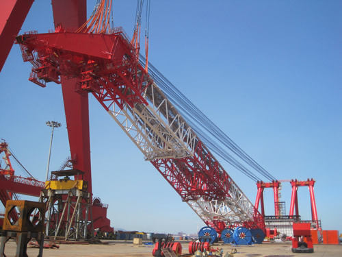8月18日下午,青島海西重機在自己的突堤碼頭內順利完成3600t浮吊1#臂架的最后吊裝。至此,3600t浮吊臂架安裝、鋼絲繩纏繞、臂架拉起的三步驟吊裝均已勝利完工。該臂架總重1200T,長130M,寬24米,高10米,是典型超長、超大、超重件,通過對國內首創(chuàng)的突堤碼頭和自制1600t龍門吊的完美組合使用,海西重機自主創(chuàng)新以獨特的方式攻克了超大型構件的吊裝以及吊裝中動態(tài)傾斜安裝的技術難題,突破了浮吊加駁船安裝浮吊的傳統(tǒng)安裝方式,降低了安裝成本,使施工安裝風險得到充分可控,施工周期也大大縮短。