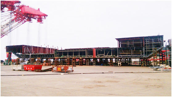 90米平臺船頭船尾的順利貫通是整船建造過程中的一個重要節(jié)點,標志著整船工作重心從結(jié)構(gòu)件分段制作順利過渡到船臺整體搭載,為該平臺如期順利下水奠定了基礎(chǔ)。