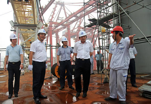 7月15日,中船重工副總經理董強深入海西重機生產現(xiàn)場,查看了在制的90米自升式海洋平臺項目、為海南洋浦批量研制的岸橋、輪胎吊項目以及出口意大利的超巴拿馬岸橋(60t-62m岸橋)項目等,并就產品種類調整實效、安全生產責任制落實等與各級干部進行交流,提出了指導意見。
