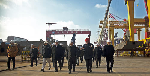 許克振一行實地考察了海西重機生產(chǎn)現(xiàn)場及組裝發(fā)運現(xiàn)場,參觀了包括韓國批量岸橋、自動化軌道吊等在內(nèi)的港口機械設(shè)備及在制的批量自升式海工平臺項目,看望慰問了生產(chǎn)一線干部職工,并在隨后召開的中船重工青島海西灣基地相關(guān)企業(yè)負責(zé)人座談會上,聽取了海西重機董事長孫總關(guān)于企業(yè)產(chǎn)品結(jié)構(gòu)、技術(shù)創(chuàng)新、生產(chǎn)經(jīng)營及中長期發(fā)展規(guī)劃等方面的情況匯報。