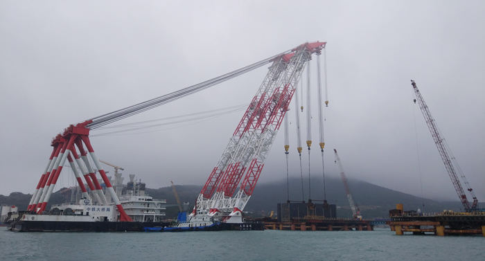 為該項(xiàng)目的主承建方——中鐵大橋局量身打造的3600噸浮式起重機(jī),由青島海西重機(jī)自主研發(fā)、設(shè)計(jì)、制造、安裝和調(diào)試,采用變幅式雙臂架結(jié)構(gòu),其起重重量為3600噸,最高起升高度110米,不僅減小了橋梁吊裝吊具結(jié)構(gòu),而且提高了橋梁吊裝的有效高度,極大地滿足了橋梁吊裝施工的要求,經(jīng)受住了現(xiàn)場(chǎng)惡劣海況的考驗(yàn),成為大橋建設(shè)“左膀右臂”,被用戶親切地稱為“海上建橋神器”。
