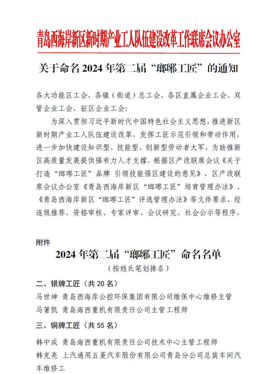 為深入貫徹習(xí)近平新時代中國特色社會主義思想,推進(jìn)新區(qū)新時期產(chǎn)業(yè)工人隊伍建設(shè)改革,發(fā)揮工匠示范引領(lǐng)和帶動作用,進(jìn)一步加快建設(shè)知識型、技能型、創(chuàng)新型勞動者大軍,為助推新區(qū)高質(zhì)量發(fā)展提供強有力人才支撐,根據(jù)區(qū)產(chǎn)改聯(lián)席會議《關(guān)于打造“瑯琊工匠”品牌引領(lǐng)技能強區(qū)建設(shè)的意見》、區(qū)產(chǎn)改聯(lián)席會議辦公室《青島西海岸新區(qū)“瑯琊工匠”培育管理辦法》、《青島西海岸新區(qū)“瑯琊工匠”評選管理辦法》等文件要求,經(jīng)逐級推薦、資格審核、專家評審、會議研究、社會公示等程序,最終100 名同志脫穎而出,入選新區(qū)第二屆“瑯琊工匠”。