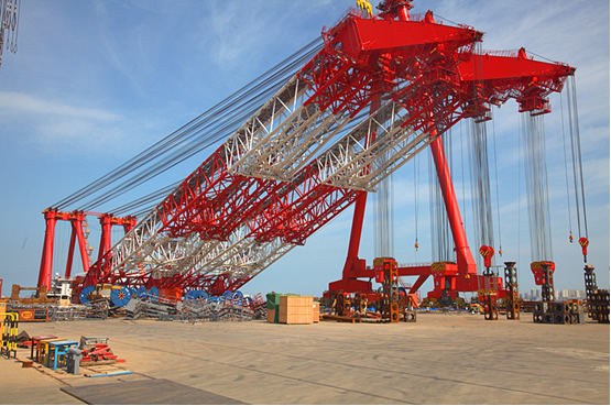 第一次穿繞超特長起重鋼絲繩:產(chǎn)品鋼絲繩直徑54mm、單根長度7000米(共4根),單套引繩12000米,合計數(shù)萬米的鋼絲繩通過兩套牽引設(shè)備在空中相距300米的60個滑輪之間來回穿梭,猶如巨龍在空中盤旋,空中曲線優(yōu)雅而美麗。利用海西重機突堤碼頭和1600t龍門吊的完美組合、設(shè)計獨特的工裝和工藝方案成功實現(xiàn)3600t浮吊的安裝,在海西重機是第一次,在國內(nèi)也屬首創(chuàng)。